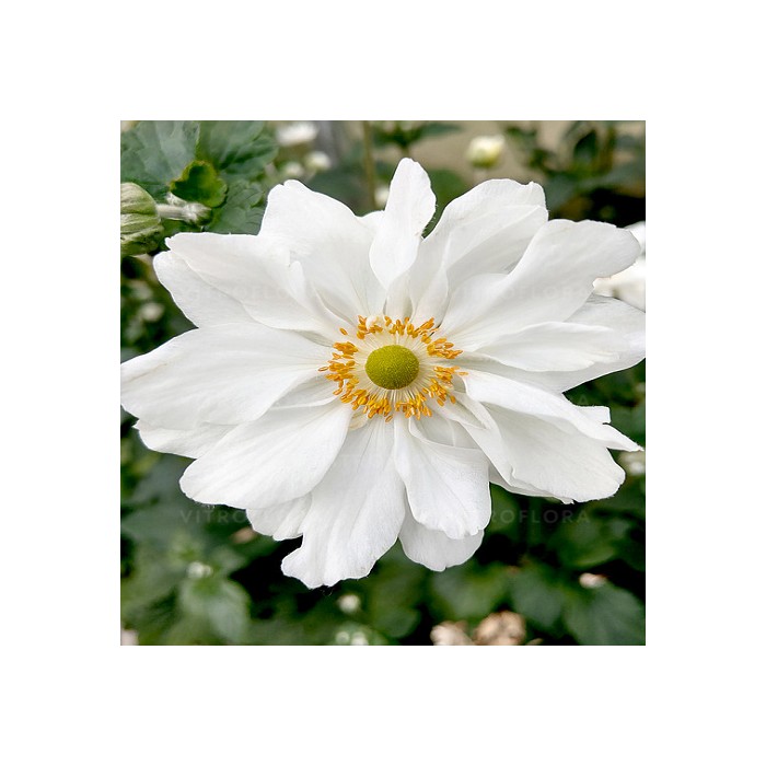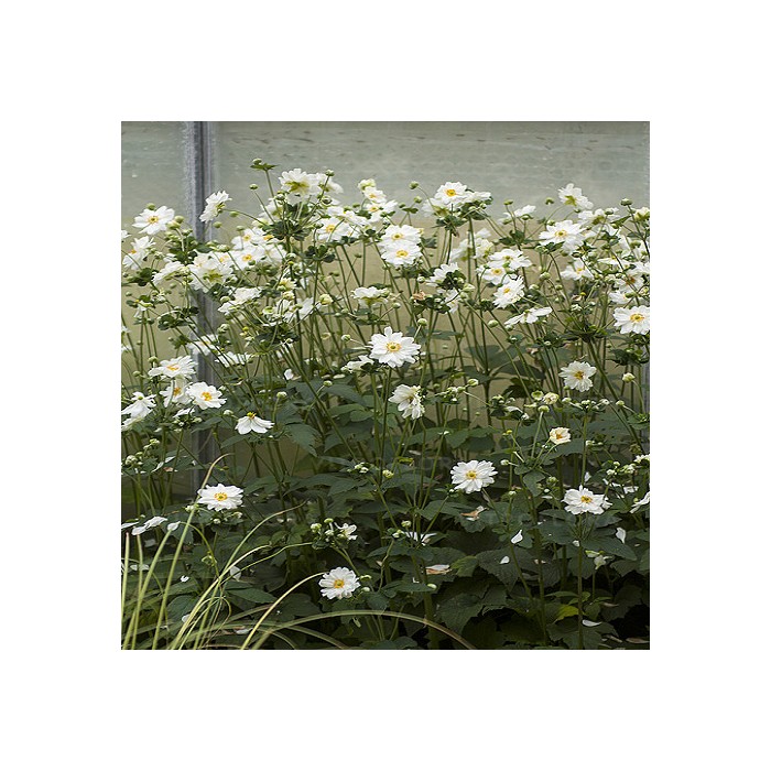 Zawilec o białych, półpełnych kwiatach wysokości 100 cm.