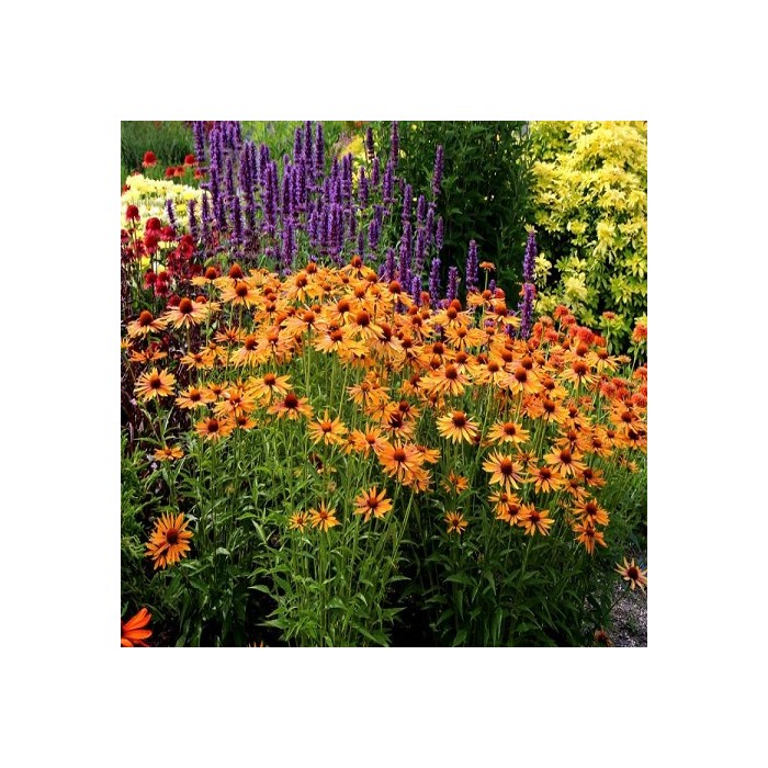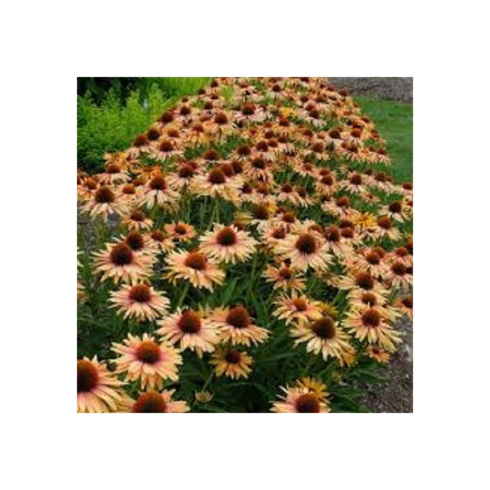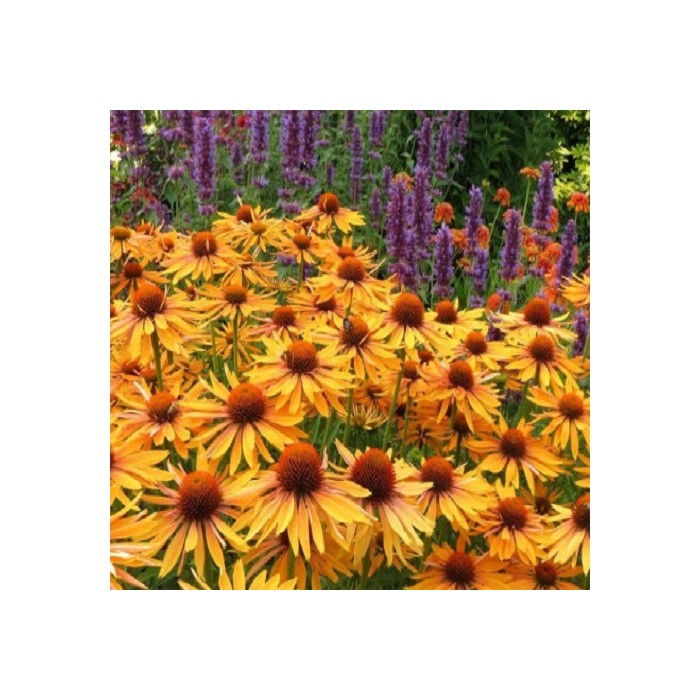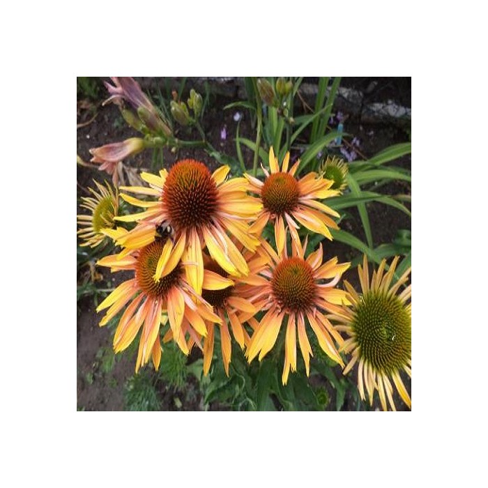 Jeżówka o żółto-pomarańczowych kwiatach, które zaczynają się pojawiać początkiem lipca i trwa to, aż do września. Kwiaty zbudowane są z wypukłej, kolczastej, bordowej główki, która otulona jest języczkowatymi płatkami w ciepłych odcieniach pomarańczy. Końcówki płatków są koloru mango, natomiast bliżej środka przebarwiając się na miodowo i pomarańczowo. Roślina tworzy gęste kępy z soczyście zielonych liści, z której wyrastają sztywne pędy, a na nich rozkwita się olśniewający widokiem kwiat. Wysokość rośliny 65 cm. Jeżówka oprócz tego, że doskonale zdobi i wypełnia kolorem miejsca w ogrodzie jest rośliną miododajną i chętnie odwiedzana jest przez pszczoły i motyle co jest dodatkową zaletą. Stanowią niezastąpiony element barw na rabatach prze całe lato. Uprawa Jeżówek nie jest kłopotliwa, dlatego polecana jest dla każdego miłośnika ogrodu. Należy zapewnić jej dobrze przepuszczalne, ale wilgotne podłoże. Dla obfitszego kwitnienia powinna być nawożona i regularnie obcinany przekwitający kwiatostan. Preferuje miejsca w pełni słoneczne, ponieważ w cieniu jej kwiaty mogą być mniejsze i mniej liczne. Roślinę należy przycinać przed nadejściem przymrozków, dlatego najlepiej zrobić to późną jesienią, po przekwitnięciu.