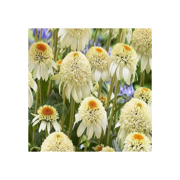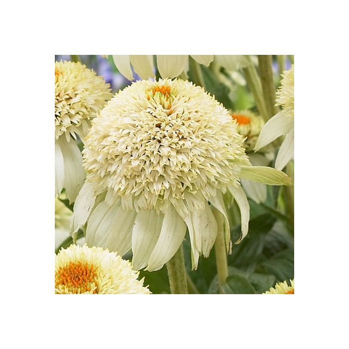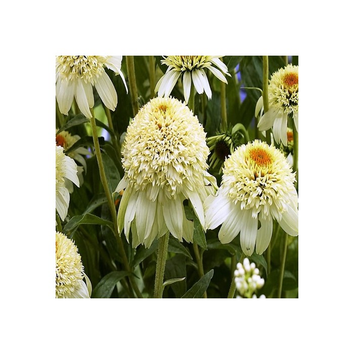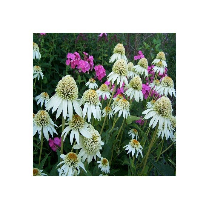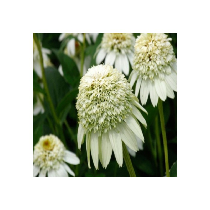 Jeżówka o mleczno-białych kwiatach zaczyna kwitnienie od czerwca i trwa to, aż do września. Kwiaty olśniewają nietypową, elegancką budową co najbardziej przyciąga nasze zainteresowanie. Roślina o dużych, pełnych kwiatach otoczone są długimi, opadającymi płatkami o mleczno-białym kolorze. Tworzy zwarte, dobrze rozkrzewione kępy z ciemnozielonych liści, z której wyrastają sztywne pędy, a na nich rozkwita się urzekający, pomponiasty kwiat. Wysokość rośliny 70 cm. Jeżówka oprócz tego, że doskonale zdobi i wypełnia kolorem miejsca w ogrodzie jest rośliną miododajną i chętnie odwiedzana jest przez pszczoły i motyle co jest dodatkową zaletą. Stanowią niezastąpiony element barw na rabatach prze całe lato. Uprawa Jeżówek nie jest kłopotliwa, dlatego polecana jest dla każdego miłośnika ogrodu. Należy zapewnić jej dobrze przepuszczalne, ale wilgotne podłoże. Dla obfitszego kwitnienia powinna być nawożona i regularnie obcinany przekwitający kwiatostan. Preferuje miejsca w pełni słoneczne, ponieważ w cieniu jej kwiaty mogą być mniejsze i mniej liczne. Roślinę należy przycinać przed nadejściem przymrozków,