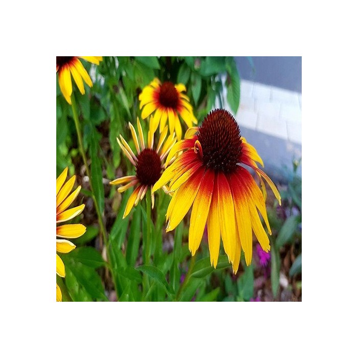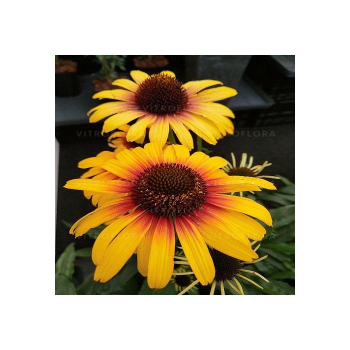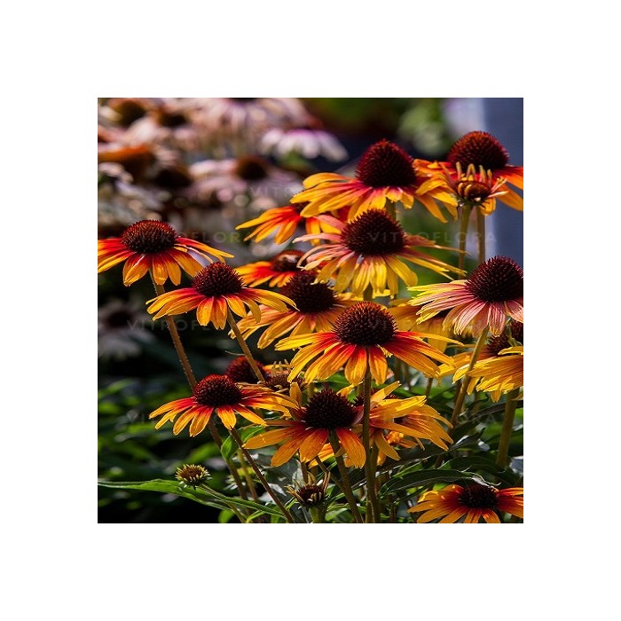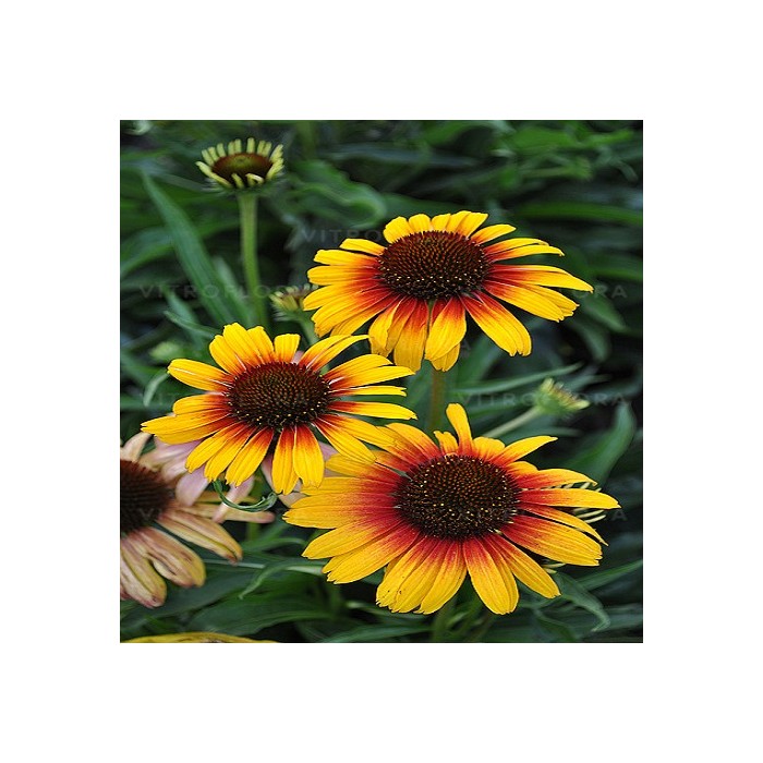 Jeżówka o czerwono-żółtych kwiatach, które zaczynają się pojawiać początkiem lipca i trwa to, aż do września. Kwiaty zbudowane są z wypukłej, kolczastej, bordowej główki, która otulona jest języczkowatymi płatkami w dwubarwnym kolorze. Mają one żółtą barwę przechodzącą w czerwień w kierunku środka kwiatu. Roślina tworzy gęste kępy z soczyście zielonych liści, z której wyrastają sztywne pędy, a na nich rozkwita się olśniewający widokiem kwiat. Wysokość rośliny 40 cm. Jeżówka oprócz tego, że doskonale zdobi i wypełnia kolorem miejsca w ogrodzie jest rośliną miododajną i chętnie odwiedzana jest przez pszczoły i motyle co jest dodatkową zaletą. Stanowią niezastąpiony element barw na rabatach prze całe lato. Uprawa Jeżówek nie jest kłopotliwa, dlatego polecana jest dla każdego miłośnika ogrodu. Należy zapewnić jej dobrze przepuszczalne, ale wilgotne podłoże. Dla obfitszego kwitnienia powinna być nawożona i regularnie obcinany przekwitający kwiatostan. Preferuje miejsca w pełni słoneczne, ponieważ w cieniu jej kwiaty mogą być mniejsze i mniej liczne. Roślinę należy przycinać przed nadejściem przymrozków, dlatego najlepiej zrobić to późną jesienią, po przekwitnięciu.