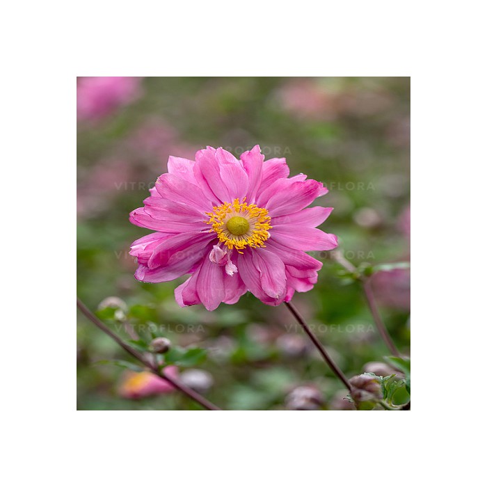 Zawilec o ciemnoróżowych, półpełnych kwiatach wysokości 70 cm.
