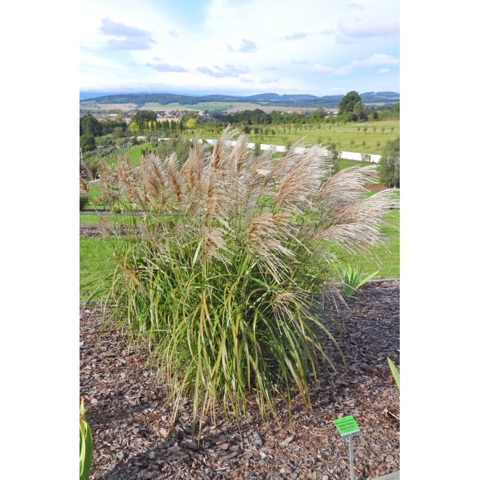 Imponująca odmiana Miskant dorastająca do około 2m wys. Tworzy zwarte kępy z średnio szerokich, jasnozielonych liści z białym, podłużnym paskiem w środku. Obfite kwitnienie rozpoczyna w połowie sierpnia efektownymi wiechami barwy złocistej. Jesienią po zaschnięciu całej kępy związujemy ją w chochoła. Wiosną ścinamy całość przy ziemi.