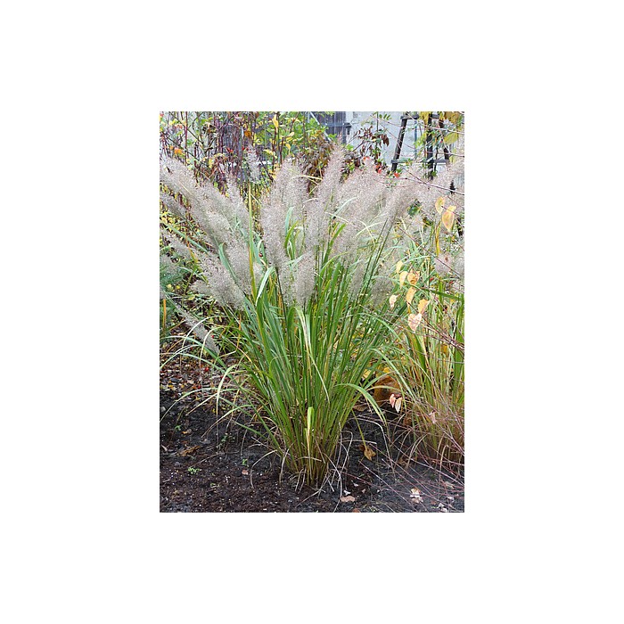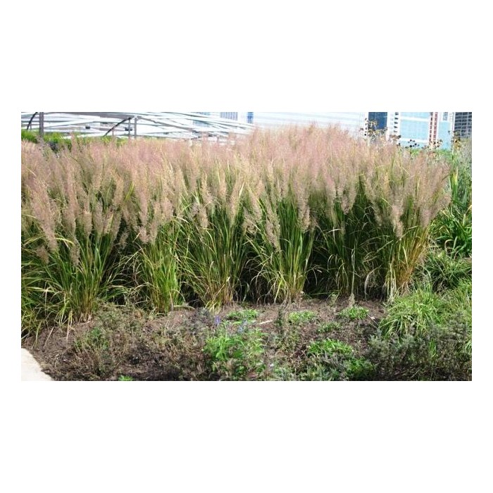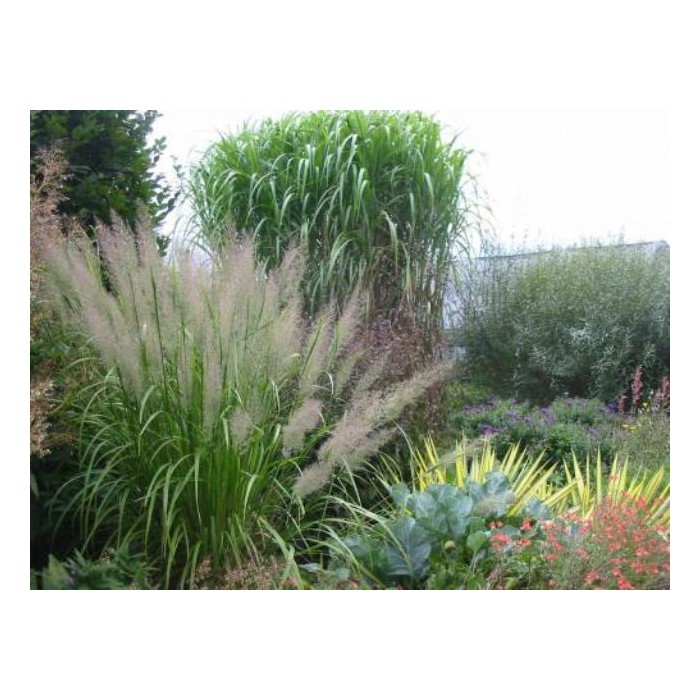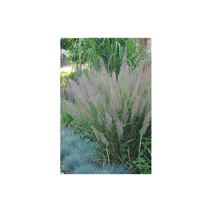 Calamagrostis Brachytricha-trawa o białych kwiatach i zielonym ulistnieniu wysokości 100 cm.