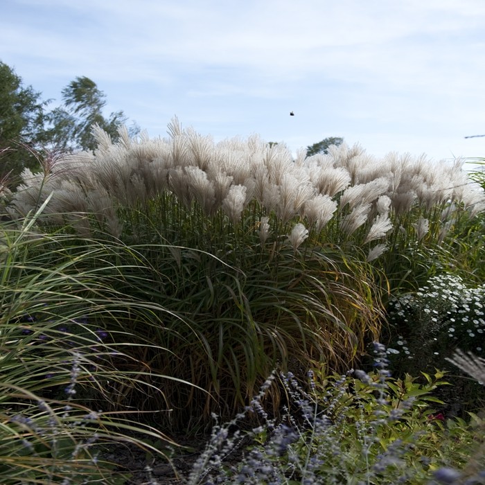 Miskant 160 cm wys.,który tworzy z zielonych z wyraźnym białym paskiem pośrodku liścia, niezwykle efektowną kępę. Ozdobą rośliny są pojawiające się wachlarzowate wiechy w różowym kolorze na przełomie lipca/sierpnia.Jesienią po zaschnięciu całej kępy związujemy ją w chochoła. Wiosną ścinamy całość przy ziemi.