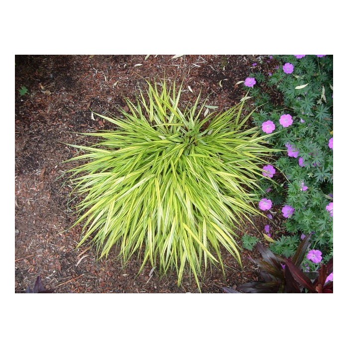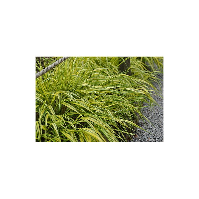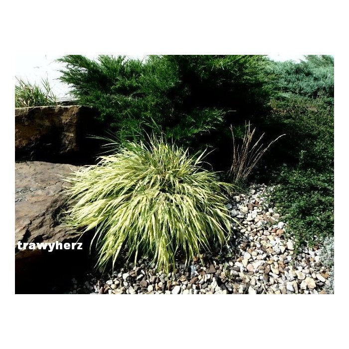 Hakonechloa smukła to paskowana trawa kępkowa 40 cm wysokości. Jej długie, smukłe liście układają się w harmonijne, zwiewne kępy, dodając ogrodowi subtelności i wyjątkowego charakteru. Wyróżnia się złocistym odcieniem liści, ozdobionych zielonymi paskami wzdłuż krawędzi, co nadaje jej niepowtarzalnego uroku. W okresie letnim pojawiające się ażurowe wiechy unosząc się nad rozłożystą kępą, dodając ogrodowi subtelności i lekkości. To niezapomniane widowisko, gdy złote liście kontrastują z delikatnymi kwiatostanami, tworząc niepowtarzalną kompozycję. Emanuje spokojem i delikatnością, tworząc niepowtarzalną atmosferę w otoczeniu. Jesienią, w reakcji na chłodne dni, niektóre liście przybierają różowy odcień i są jak kropka nad "i" w tej fascynującej przygodzie z naturą. Rozświetl swoją przestrzeń ogrodową złotym blaskiem Hakonechloa 'Aurea', bo zasługujesz na ogród, który jest prawdziwą gwiazdą wśród ogrodowych kompozycji! Roślina zasycha na zimę, więc wiosną ścinamy całość nisko przy ziemi.